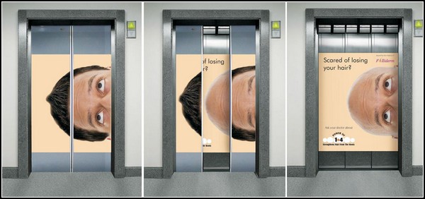 Облысение - самая печальная и неприятная проблема у мужчин. Не считая простатита и импотенции. И самая заметная. Оформив лифты в жилых домах подобным образом, индийская рекламная студия Sorento Healthcare Communications художественно и креативно привлекает внимание не только к самой проблеме, но и к способам ее решения.