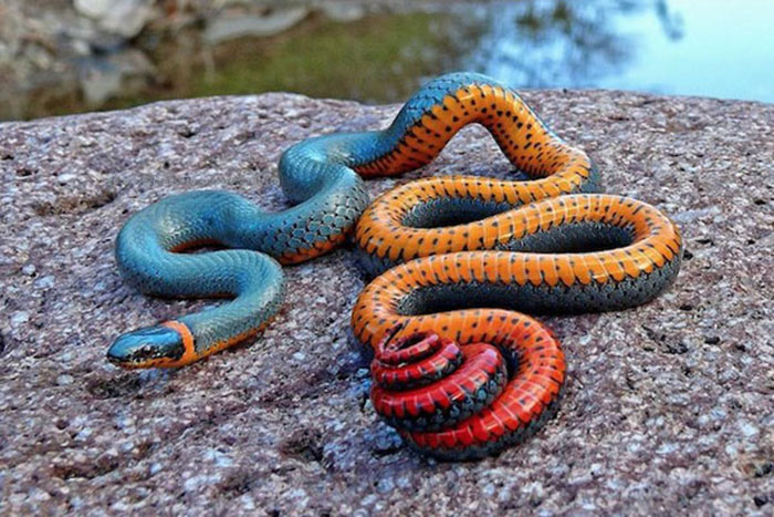 Туловище изящное, стройное. Окраска варьируется от светло-серого до чёрного цвета, и почти всегда позади головы имеется яркая жёлтая или оранжевая полоса. Брюхо оранжевое, а хвост снизу красный.