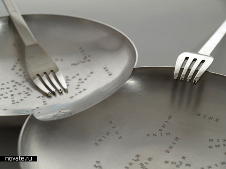 В набор входит несколько посудин. Тут и тарелки, и вилки, и ложки, и ножи. И все он созданы для конкретной пары. Например, на одной из тарелок выгравировано очень мелким шрифтом то тут, то там слово «Вилка». Ничего особенного, если бы не одно НО. На зубчиках вилки из этого же набора также изображены именно эти буквы. На другой тарелке же написано «Моя», соответственно и на вилке – то же самое. Весьма забавно все это смотрится.