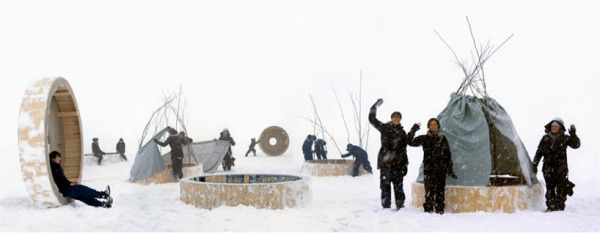Одним из ключевых объектов импровизированного городка стала мобильная сауна, поставленная на специальные полозья-лыжи и с легкостью перемещаемая по снегу в любое место. Силами студентов была построена и серия временных "бунгало" - Aurora observatory. Эти коммунальные функциональные объекты стали их посильным вкладом в улучшение условий жизни местных рыболовов.