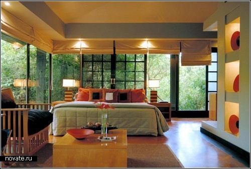 В стеклянной гостинице Phinda Forest Lodge, расположенной в Южной Африке, не-стеклянные только полы: они сделаны из особой породы очень прочного африканского дерева. Однако постояльцам нечего бояться, что посторонние могут увидеть их голую, пардон, попу, благодаря фактически отсутствующим стенам. Гостиница насчитывает всего лишь 16 номеров, а ее удачное расположение - парк-заповедник, в глубине песчаного экзотического леса Dry Sand Forest - гарантирует отсутствие сторонних наблюдателей и комфортный отдых на природе, который могут потревожить разве что животные, свободно гуляющие по парку.