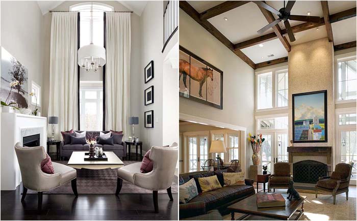 Если комната с высокими потолками и большими окнами, шторы станут самым легким способом в решении проблемы визуального уменьшения высоты. Не стоит использовать в этом случае укороченные портьеры, которые выглядят неуклюже и фрагментируют пространство. Если шторы под цвет стен смягчат декор, то яркие добавят волшебства и игривости. Портьеры также добавят текстуру и геометрические элементы, всё зависит от выбранной ткани.