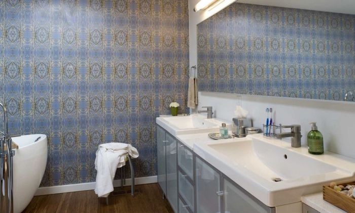 Оригинальный узор на стенах создаст в ванной комнате уютную атмосферу.