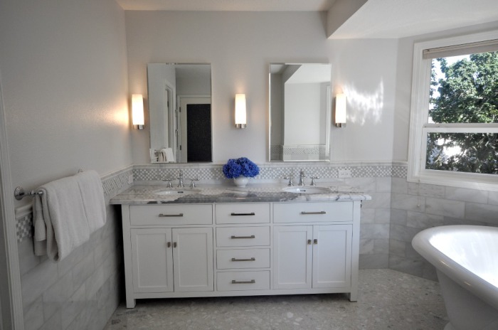 Порцеляновая плитка добавит деликатной женственности комнате. Акцент на фигурных краях добавит легкости и изысканности в ванной.