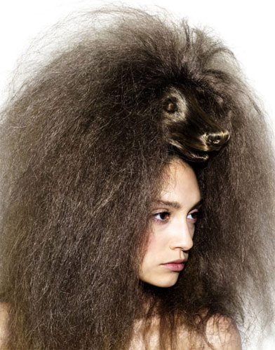 Что это – шляпа или парик, я до сих пор не решил, потому что с первого взгляда не очень-то и определишь, свои это волосы были искусно уложены в виде морд животных или все же волосы искусственные и это своеобразная шляпа.