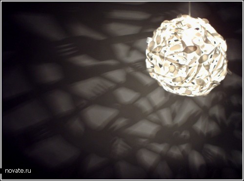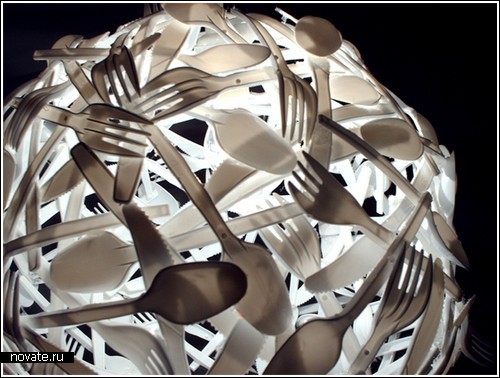 Если смотреть издалека и не особо всматриваться в детали, можно и не заметить, из чего же эта лампа сделана. Какой-то светящийся шар, который смотрится, на самом-то деле, очень красиво. Но…издали. Лишь только мы к нему приближаемся, ошибиться невозможно – да это же самая дешевая лампа из всех, что можно было видеть! Слишком грубо сказано? Но как еще можно назвать лампу, сделанную целиком из пластиковых столовых приборов? Полагаю, цена здесь является важной составляющей, но не только. Гораздо важнее то, что лампа является чудесным решением с точки зрения экологии.