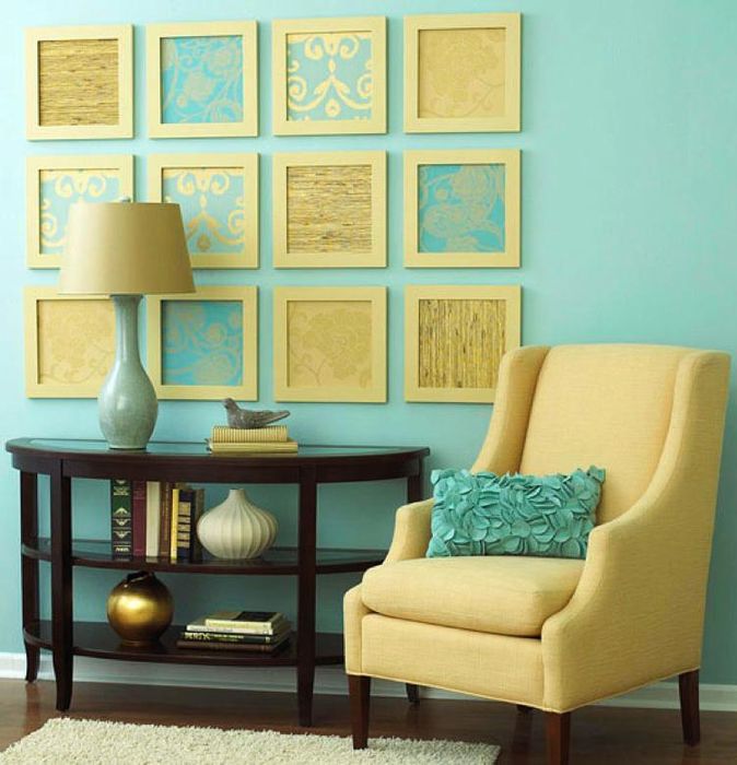Когда кажется, что фото и постеры в рамках смотрятся слишком банально, есть смысл заменить из чем-нибудь более оригинальным и интересным. Например, поставить в рамы одинакового формата и цвета отрезки разных цветов и комбинаций. Главное, чтобы такой декор перекликался по цвету или рисунку с окружающими предметами интерьера.