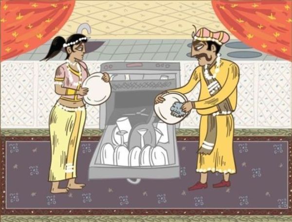 Позиция «Посудомойка». Здесь явная смена ролей. Сначала в супружеской паре активен мужчина: он загружает грязные тарелки в посудомойку. Затем инициативу перехватывает женщина, которая пришла проконтролировать нерадивого мужа, ведь он вечно все делает не так.