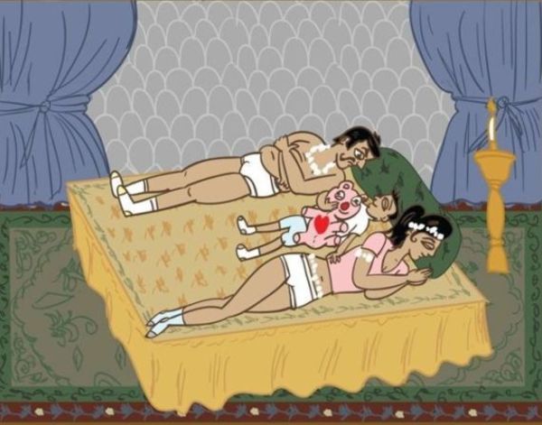 Позиция «2+1». Здесь мужчина явно хочет секса, но мешает ребенок, которому приснился страшный сон, и он перебрался спать к родителям. Классическая поза для супругов с детьми.