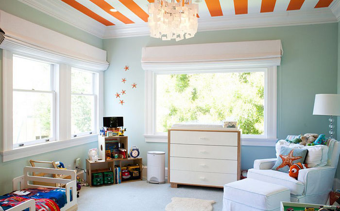 Возможно, звёздное небо не кажется слишком оригинальным решением, и в то же время не хочется ничего экстравагантного, тогда можно прибегнуть к простому трюку. Достаточно будет выбрать универсальный фон, который органично вписывается в любую тему. Дизайнеры предлагают несколько вариантов таких трансформаций. Самый простой - краска, не нужно недооценивать визуальный эффект красивого яркого потолка. Стоит отказаться от скучного белого цвета и выбрать оттенки, которые подчёркивают цветовую палитру комнаты и выбранную для неё тему. Сочетание чёрного и тёмно-серого может стать потрясающим. Пастельные тона, полоски тоже изменять потолок до неузнаваемости, сделав его стильным и уникальным.