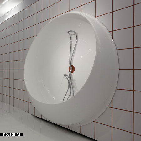 Ну, и как можно догадаться, для того, чтобы слить воду, нужно снова вращать ванную! Единственный минус – полежать в ней не удастся, а только посидеть. Возможно, именно он является главным недостатком ванной такого плана. В остальном же проект очень занимателен, ведь других таких идей мы еще не встречали. Ведь это и душ, и ванная сразу!