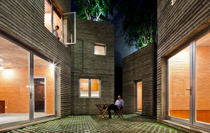 Каждый дом в комплексе выполняет свою функцию. В самом маленьком строении находится традиционный алтарь, где молятся вьетнамцы, а в остальных оборудованы жилые помещения: гостиная, спальни, кухня, библиотека. Дома соединены между собой металлическими мостиками и вместе образуют небольшой дворик, где под тенью деревьев, скрытые от посторонних взглядов, хозяева могут уединиться и отдохнуть.