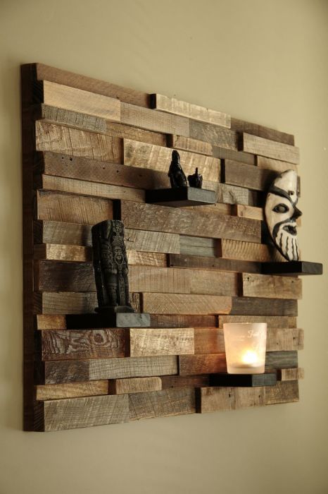 Интересная идея оформления стены - объемная картина из брусков и деревянных планок, на которой можно разместить множество декоративных элементов.