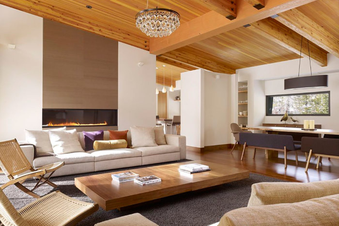 Главные элементы дизайна помещения с множеством деревянных элементов - это уютная и спокойная обстановка.