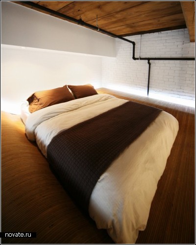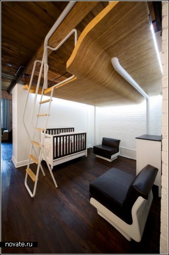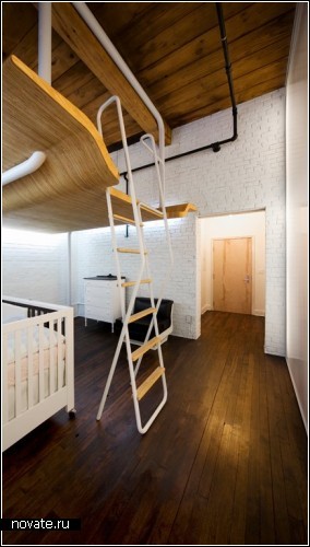 Как можно увидеть, идея заключается в том, чтобы поднять родительскую кровать под потолок, буквально разделив комнату по горизонтали, и спустить вниз лестницу. Таким образом, у взрослых получится самое настоящее "любовное гнездышко", откуда можно внимательно наблюдать за "птенчиком", чья кроватка будет стоять внизу.