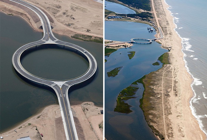 На территории одной из живописных лагун в Уругвае относительно недавно был открыт весьма нестандартный мост. Он построен не по прямой, а по окружности. Подобная задумка появилась вовсе не по прихоти архитектора, а с точным расчетом поумерить пыл лихачей. К тому же при снижении скорости водители смогут полюбоваться красотой окружающей природы.