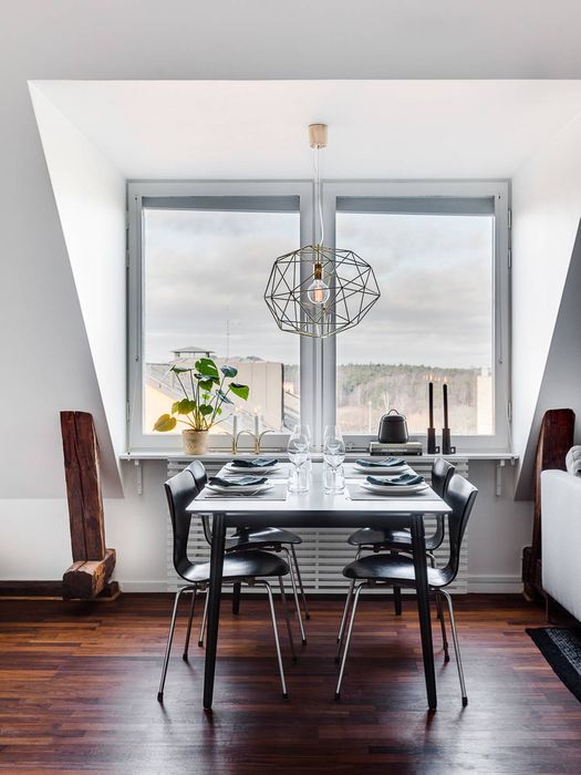 Дабы скошенные стены не вызывали ощущения тесноты, для пространства был выбран белый цвет. Также для гармонизации общей интерьерной картины в зоне столовой установили геометрический светильник, а на противоположной стене разместили постеры в прямоугольных и квадратных рамах.