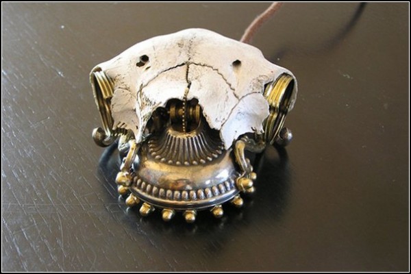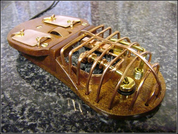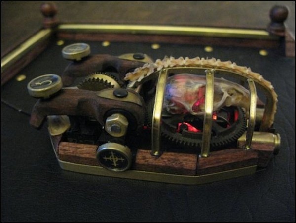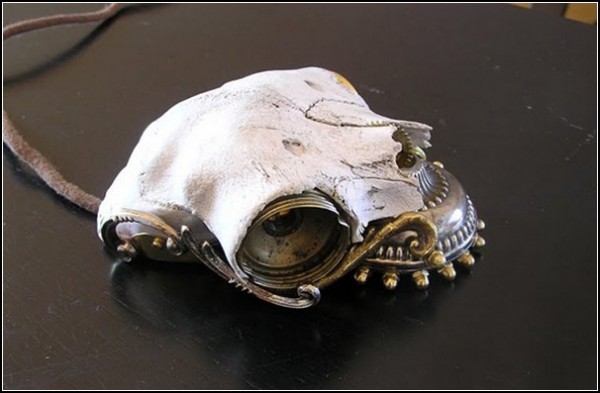 Первое место по праву занимает самая глубокомысленная из компьютерных мышей, напоминающая о тщете всего сущего. Притом она вполне функциональна: косточки-клавиши нажимаются, все работает. Основой для мышки послужил череп овцы. Конструктор этой мыши - все тот же невероятный хорват Иван Маврович, и глядя на нее, вопроса "Быть или не быть стимпанку" не возникает. Безусловно, быть - ведь это красиво!