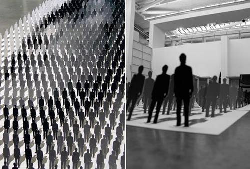 Это коллаж из маленьких бумажных фигур, которые, если их рассмотреть сверху, создают образ, изображение художника. Если взять к примеру Стефана Сегмейстера (Stefan Sagmeister), то у него там изображены чашки, наполненные кофе и молоком в различных сочетаниях, а при виде сверху это огромный кубок. Проект Ванга сопровождается девятью книгами, которые иллюстрируют индивидуальные изображенные фигуры.