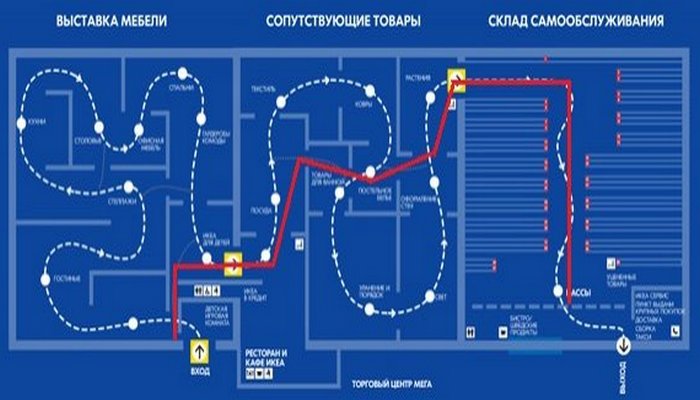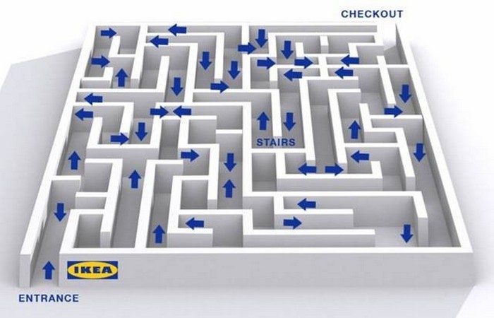 На самом деле, почти любой магазин или стенд этой компании напоминает лабиринт, который спроектирован так, чтобы покупатель увидел по дороге все возможные товары. Среди сотрудников эта планировка называется "Длинный естественный путь"