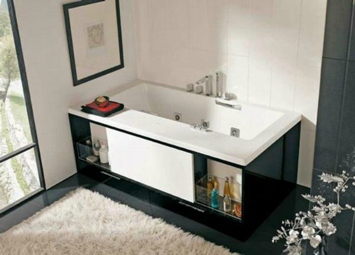 Классический черно-белый экран с раздвижными панелями для хранения банных принадлежностей и бытовой химии.