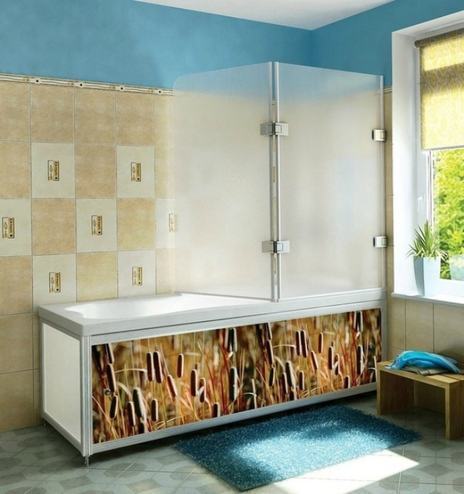 Экран с фотопечатью станет оригинальным и эстетичным оформлением ванны.