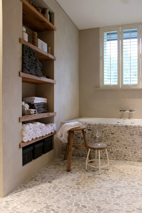 Экран, стилизованный под натуральный камень добавит в ванную комнату немного богемного шика.