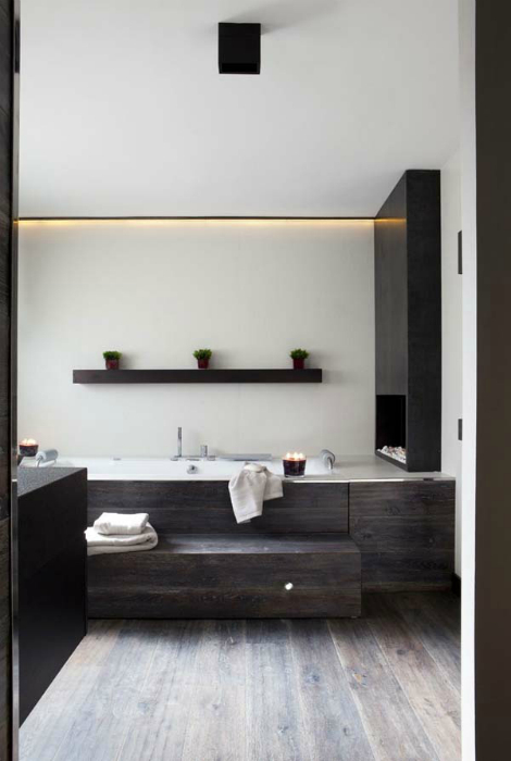 Элегантный подиум из темного дерева сделает ванну более комфортной.