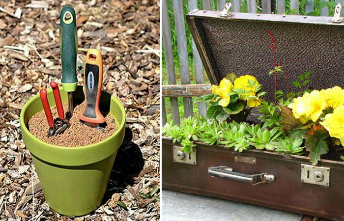 Используйте старые ржавые грабли, как удобную вешалку для мелкого садового инструмента.