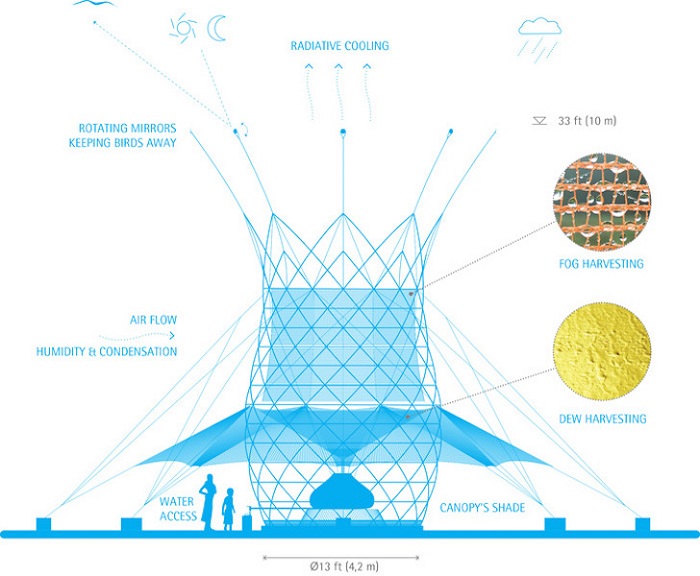 Итальянские архитекторы Arturo Vittori и Andreas Vogler разработали инновационный проект под названием Water Warka. Он представляет собой своеобразную башню, при помощи которой можно получать до 100 литров воды в день. Особенно актуально применение этой установки в самых засушливых районах Африки, где снабжение водой местного населения является большой проблемой.