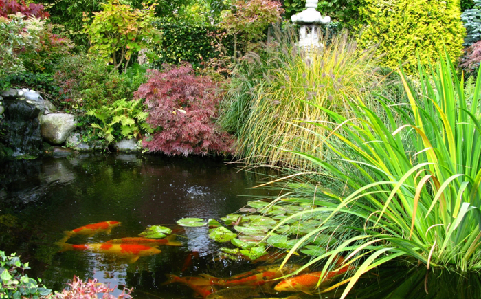 Пруд с рыбками окружен удивительными клёнами и живой изгородью.