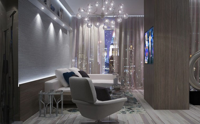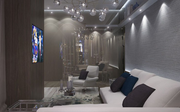 Одна из самых красивых комнат – это комната отдыха для всей семьи. Она расположена напротив зеркальной стены, благодаря которой выглядит в два раза больше, чем на самом деле. Огромный светильник, состоящий из множества маленьких шаров, охватывает всё пространство. Здесь же на несущей колоне расположился настенный телевизор. Портьеры не только закрывают окна, но и визуально отделяют комнату от других зон.