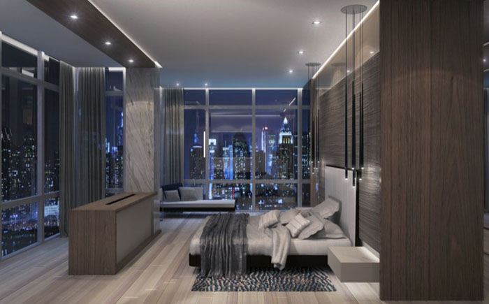 В пентхаусе огромная спальня, хотя она здесь всего лишь одна. С трёх сторон из неё открывается вид на город. Между кроватью и панорамным окном расположился небольшой туалетный столик в минималистском стиле.