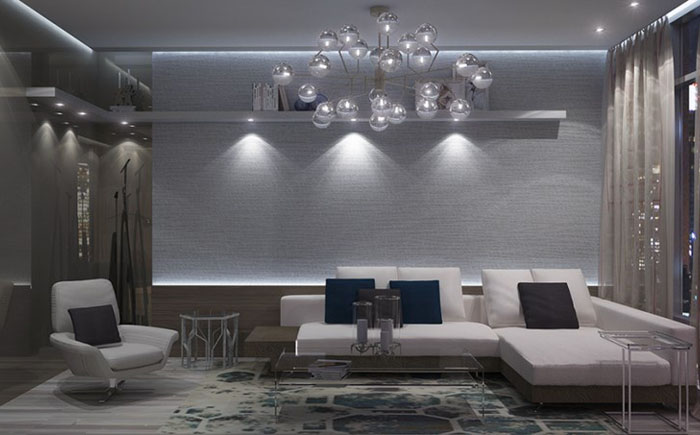 Изящные современные светильники сочетаются с точечным освещением. В результате пространство наполнено светом, даже ночью.