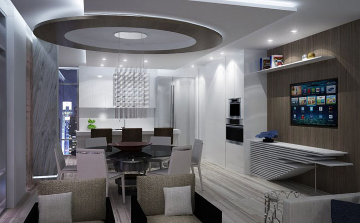 Между кухней и гостиной расположилась столовая. Её интерьер отличается оригинальными решениями в виде многоуровневого потолка, встроенный плавающих полок и мраморных колон. На деревянной панельной стене прикреплён телевизор.