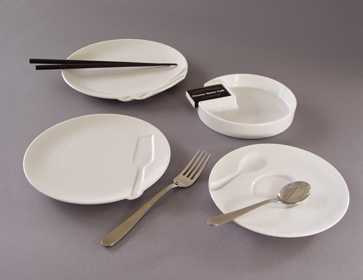 Три фарфоровые тарелки, из которых уж точно не "сбегут" столовые приборы, и пепельница с "кармашком", специально отведенным для спичек, пользуются в Японии большим спросом, поскольку общеизвестно, что японцы консерваторы, и славятся своим педантизмом. Правда, такой вариант подойдет только правшам, но левши, я думаю, не будут в обиде на дизайнера, поскольку этот набор больше похож на кухонный сувенир, чем на практичную посуду.