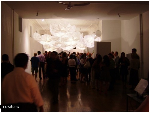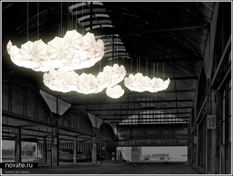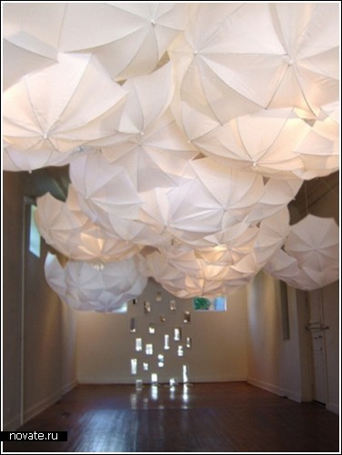 Как можно увидеть на фотографиях, дизайнер просто развесил зонтики вверх тормашками таким образом, что они составляют небольшие навесы у нас над головой. Также зонты были и освещены, а именно это свойство придает им поразительное сходство с облаками. Ведь в солнечный день облака действительно сияют.