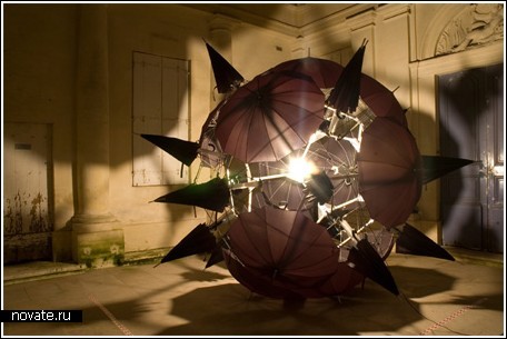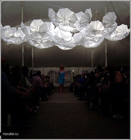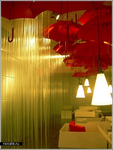 Здесь зонтики не были подвешены под потолок, а просто соединены кабелями таким образом, что некоторые находятся в открытом состоянии, а некоторые – в закрытом. Внутри же – светильник. Зрелище довольно забавное, и чем-то напоминает ежика, игрушку-колючку или даже какую-то гранату. Ассоциации могут прийти в голову самые разные - дизайнеры и фотографы постарались. Но если в предыдущем варианте зонты были выбраны белые, для сходства с облаками, здесь же – черные.