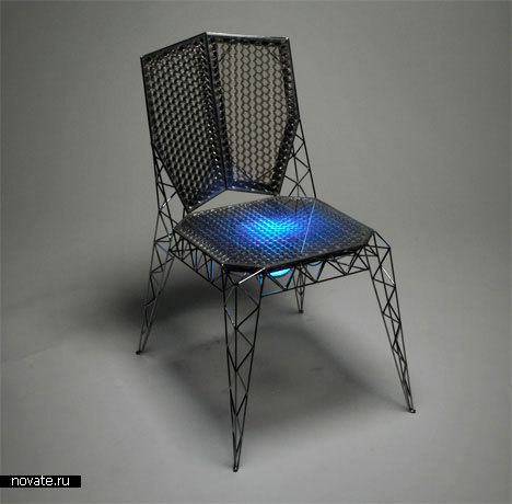 Однако, стул интересен даже не столько сотами, сколько своими ножками. Дело в том, что они выполнены из провода шириной 4 мм и уж очень напоминают линии электропередач. Надеюсь, током нас не ударит, если на такой стул сесть?! Думаю, нет. А усиливает это сходство подсветка, цвет которой можно выбрать.
