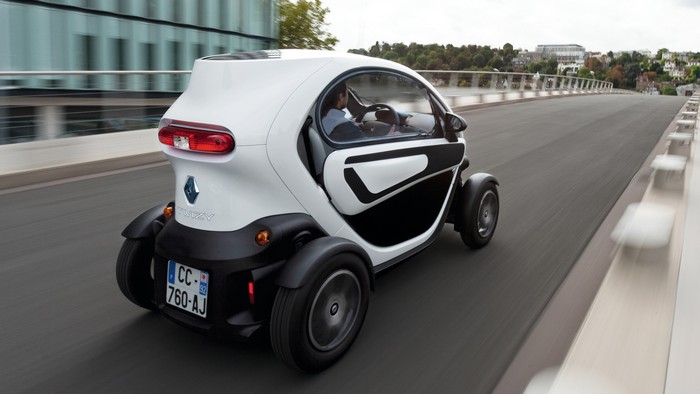 Renault Twizy может разгоняться до скорости 45 километров в час и проезжать на одном полном заряде батарей до 100 километров, чего вполне хватает при эксплуатации этого авто в условиях перегруженного мегаполиса.