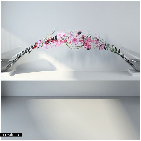 Лампа по имени «A.M.O.», созданная французским дизайнером Jean Marc Gady, словно играет с нашим воображением, создавая иллюзию и обман зрения – кажется, что и сами лампы, и цветы словно застыли на фотографии. Фотографам не составит труда совершить такой трюк, но дизайнеры уверяют – никакого секрета нет. Две лампы поставлены напротив друг друга, а вернее положены – как мы видим, они просто «свалились» на один бок. Конечно, и цветы были подобраны специальные – поставь мы сюда шикарный букет роз или одну единственную хризантему, эффект был бы абсолютно иной. Но были выбраны особенные букетики, которые, сплетаясь, и дают такой невероятно красивый эффект.