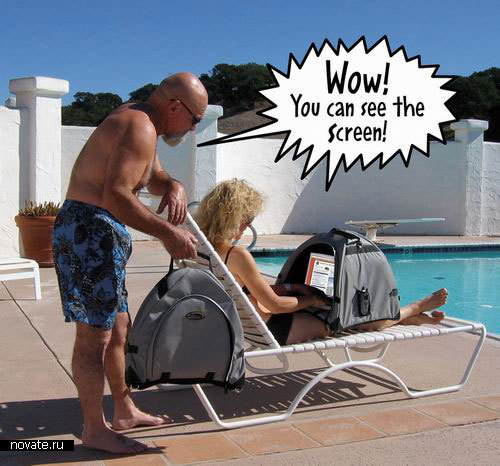 В тени порой температура ничуть не меньше, чем под солнцем. На помощь придет небольшой домик для ноутбука «LapDome». Он удобен тем, что ноутбук в нем прячется целиком, а монитор вам отлично виден. И работать таким образом очень даже комфортно – и вам, и ноутбуку. К тому же, благодаря домику можно сохранить приватность. Кому приятно чужое внимание к личным делам?