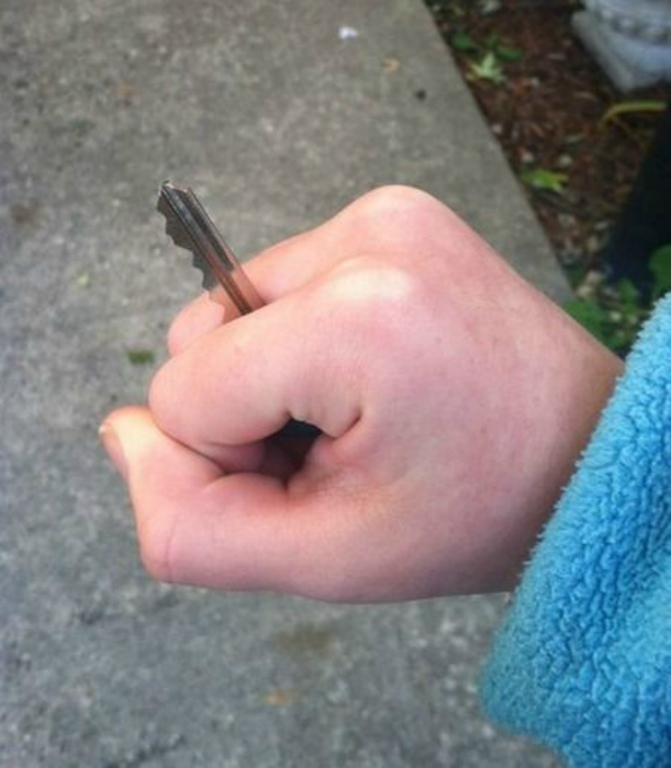 Возвращаясь, домой в вечернее время, зажмите ключ от квартиры между указательными и средним пальцами и сожмите руку в кулак. Это станет прекрасным средством самозащиты и придаст немного уверенности.