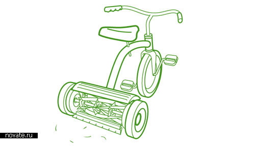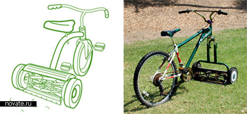 А вот это уже идея. Как было бы здорово совместить детский велосипед и газонокосилку! Но разве это возможно? Полагаю, да. в Интернете нами была найдена фотография вот этого чуда техники. Сначала появился лишь рисунок, видимо проект задумывался еще давно. И теперь такая вот его реализация.