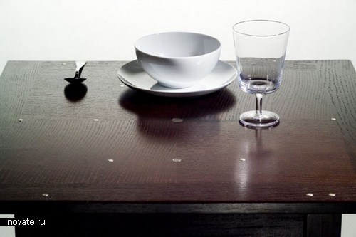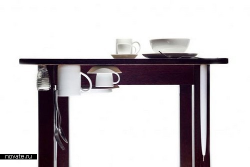 Оригинальность этого кухонного столика - в магнитной поверхности, благодаря чему всю посуду, тоже специальную, со встроенными магнитами, можно разместить прямо под столешницей. В результате - вся посуда под рукой (вернее, под столом), а на кухне больше свободного пространства, поскольку нет необходимости в дополнительном буфете, да и посуда упорядочена.