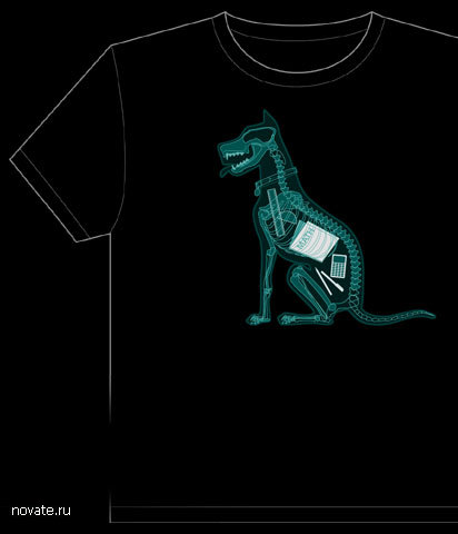 Футболки бывают разные – черные, белые, красные… Тут – черная. На ней изображена собака под действием рентгеновских лучей. Из-за них мы можем наблюдать, что это именно она, проказница, съела учебник по математике, калькулятор, линейку, карандаш… И уже можно не беспокоиться, когда подходишь к преподавателю и сообщаешь, что не готов. Ведь все написано, если не на лбу, то на футболке изображено достаточно ярко. Не поверить вам он просто не сможет! Только прокатит ли такая идея второй раз? Надеюсь, дизайнер Glennz порадует нас и еще чем-нибудь. Пока же и этой идеи хватит. Думаю, к первому сентября всем студентам нужно будет запастись такой одежкой. Один раз она вас точно выручит!
