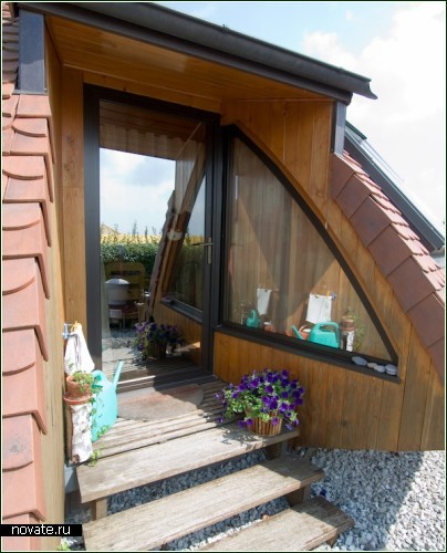 Что еще известно об этих необычных зданиях, кроме "инопланетной" формы? Ну, во-первых, все конструкции изготовлены из натурального дерева, изоляцией служит натуральная пробка, так что и тепло, и уютно, и "зелено" к тому же. Куполообразная крыша может быть двух видов: либо с большим панорамным окном, либо с солнечной батареей, которая и обогреет дом, и снабдит его электроэнергией.