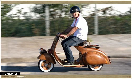 Карлос использовал в работе несколько пород дерева, а за основу взял старинный скутер от Vespa, старинный настолько, что ездить на нем было невозможно. Зато теперь он достоен того, чтобы участвовать в выставках, не говоря уже о том, чтобы возить по дорогам своего творца.