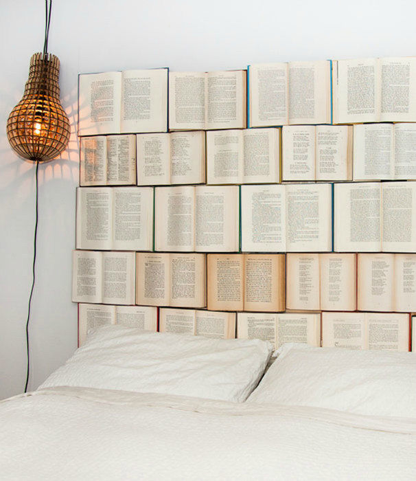 Для оригинального украшения интерьера можно использовать самые разные материалы. Например, стену в изголовье кровати можно украсить раскрытыми книгами.