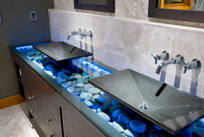 Стеклянная столешница, имитирующая поверхность воды, добавит роскоши и изысканности в интерьер ванной комнаты.